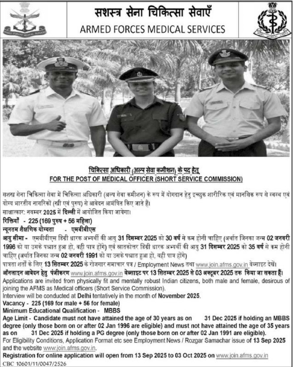 AFMS Recruitment 2025 Apply for 225 Medical Officer Vacancies in All India location. Armed Forces Medical Services Officials are recently published a job notification to fill up 225 Posts through Online mode. All the eligible aspirants can check the AFMS career official website i.e., join.afms.gov.in recruitment 2025. The last date to Apply Online on or before 03-Oct-2025.