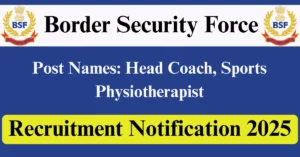 BSF Recruitment 2025 Apply for 6 Head Coach, Sports Physiotherapist Vacancies in Delhi – New Delhi, Indore, Gwalior – Madhya Pradesh, Jalandhar – Punjab location. Border Security Force Officials are recently published a job notification to fill up 6 Posts through Offline mode. All the eligible aspirants can check the BSF career official website i.e., rectt.bsf.gov.in recruitment 2025. The last date to Apply Offline on or before 15-Oct-2025.