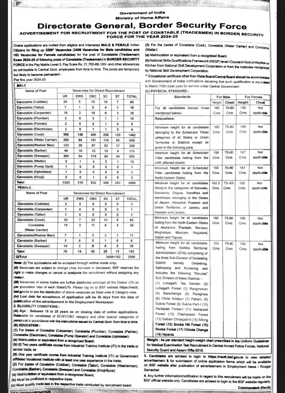 BSF Recruitment 2025 Apply for 3588 Constable Vacancies in All India location. Border Security Force Officials are recently published a job notification to fill up 3588 Posts through Online mode. All the eligible aspirants can check the BSF career official website i.e., rectt.bsf.gov.in recruitment 2025. The last date to Apply Online on or before 23-Aug-2025.