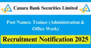 Canara Bank Securities Recruitment 2025 Apply for Various Trainee (Administration & Office Work) Vacancies in Bengaluru – Karnataka, Mumbai – Maharashtra location. Canara Bank Securities Limited Officials are recently published a job notification to fill up Various Posts through E-Mail mode. All the eligible aspirants can check the Canara Bank Securities career official website i.e., canmoney.in recruitment 2025. The last date to send an E-Mail on or before 17-Oct-2025.