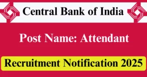 Central Bank of India Recruitment 2025 Apply for 1 Attendant Vacancies in Ahmednagar – Maharashtra location. Central Bank of India Officials are recently published a job notification to fill up 1 Posts through Offline mode. All the eligible aspirants can check the Central Bank of India career official website i.e., centralbankofindia.co.in recruitment 2025. The last date to Apply Offline on or before 25-Nov-2025.