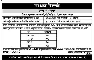 Interested and eligible candidates can apply Online at Central Railway official website rrccr.com, Starting from 01-08-2025 to 31-Aug-2025