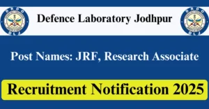 DRDO DLJ Recruitment 2025 Apply for 9 JRF, Research Associate Vacancies in Jodhpur – Rajasthan location. Defence Laboratory Jodhpur Officials are recently published a job notification to fill up 9 Posts through Walkin mode. All the eligible aspirants can check the DRDO DLJ career official website i.e., drdo.gov.in recruitment 2025. The last date to attend for Walk-in-interview on 10-Jul-2025.