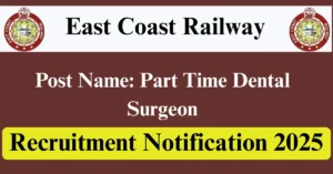 East Coast Railway Recruitment 2025 Apply for 01 Part-Time Dental Surgeon Vacancies in Khordha – Odisha location. East Coast Railway Officials are recently published a job notification to fill up 01 Posts through Walkin mode. All the eligible aspirants can check the East Coast Railway career official website i.e., eastcoastrail.indianrailways.gov.in recruitment 2025. The last date to attend for Walk-in-interview on 20-Jun-2025.