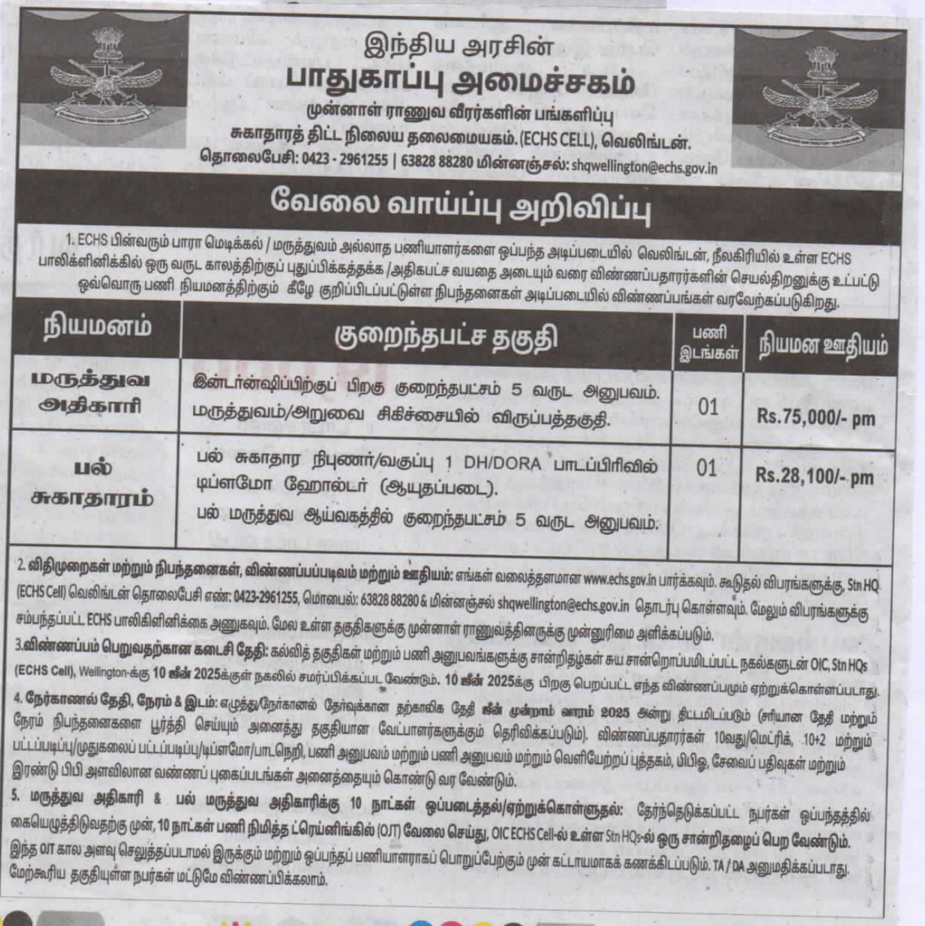 ECHS Recruitment 2025 Apply for 2 Medical Officer Vacancies in Nilgiris – Tamil Nadu location. Ex-Servicemen Contributory Health Scheme Officials are recently published a job notification to fill up 2 Posts through Offline mode. All the eligible aspirants can check the ECHS career official website i.e., echs.gov.in recruitment 2025. The last date to Apply Offline on or before 10-Jun-2025.