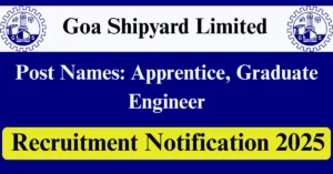 Goa Shipyard Recruitment 2025 Apply for 30 Apprentice, Graduate Engineer Vacancies in Goa location. Goa Shipyard Limited Officials are recently published a job notification to fill up 30 Posts through Offline mode. All the eligible aspirants can check the Goa Shipyard career official website i.e., goashipyard.in recruitment 2025. The last date to Apply Offline on or before 25-Jun-2025.