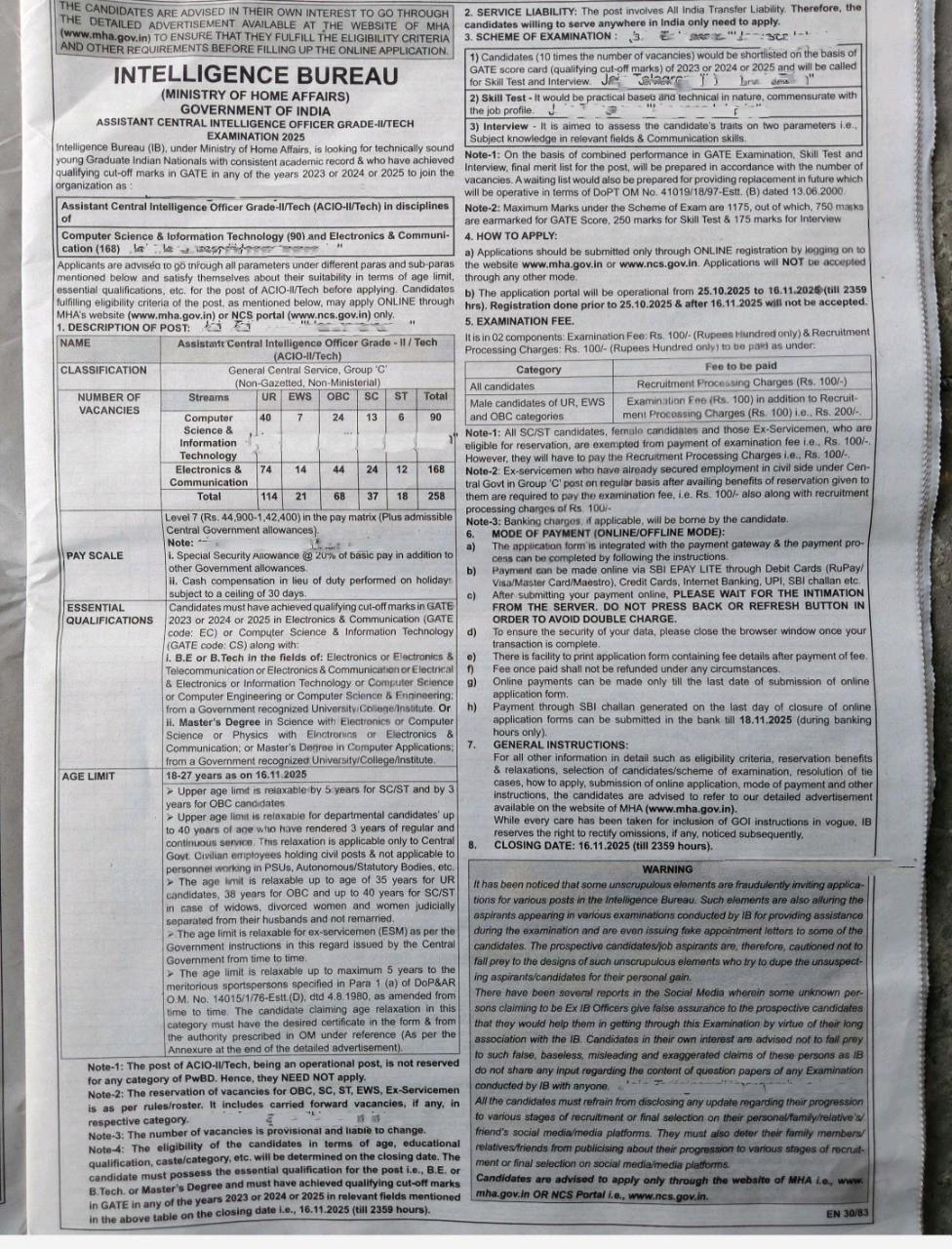 Interested and eligible candidates can apply Online at Intelligence Bureau official website mha.gov.in, Starting from 25-10-2025 to 16-Nov-2025