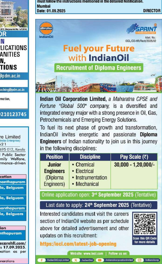 IOCL Recruitment 2025 Apply for Various Junior Engineer Vacancies in Delhi – New Delhi location. Indian Oil Corporation Limited Officials are recently published a job notification to fill up Various Posts through Online mode. All the eligible aspirants can check the IOCL career official website i.e., iocl.com recruitment 2025. The last date to Apply Online on or before 24-Sep-2025.