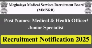 MMSRB Recruitment 2025 Apply for 77 Medical & Health Officer/ Junior Specialist Vacancies in Meghalaya location. Meghalaya Medical Services Recruitment Board Officials are recently published a job notification to fill up 77 Posts through Online mode. All the eligible aspirants can check the MMSRB career official website i.e., meghealth.gov.in recruitment 2025. The last date to Apply Online on or before 17-Aug-2025.