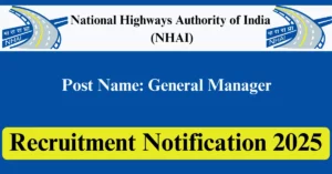 NHAI Recruitment 2025 Apply for 15 General Manager (Technical) Vacancies in All India location. National Highways Authority of India Officials are recently published a job notification to fill up 15 Posts through Online/Offline mode. All the eligible aspirants can check the NHAI career official website i.e., nhai.gov.in recruitment 2025. The last date to Apply Online/Offline on or before 28-Aug-2025.