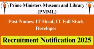 PMML Recruitment 2025 Apply for 2 IT Head, IT Full Stack Developer Vacancies in Delhi – New Delhi location. Prime Ministers Museum and Library Officials are recently published a job notification to fill up 2 Posts through Offline mode. All the eligible aspirants can check the PMML career official website i.e., pmml.nic.in recruitment 2025. The last date to Apply Offline on or before 12-Sep-2025.