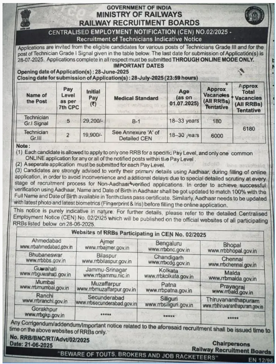 RRB Recruitment 2025 Apply for 6180 Technician Vacancies in All India location. Railway Recruitment Board Officials are recently published a job notification to fill up 6180 Posts through Online mode. All the eligible aspirants can check the RRB career official website i.e., indianrailways.gov.in recruitment 2025. The last date to Apply Online on or before 28-Jul-2025 (Extended Upto 07th August 2025).