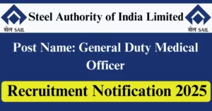 SAIL Recruitment 2025 Apply for 7 General Duty Medical Officer Vacancies in Bhilai – Chhattisgarh location. Steel Authority of India Limited Officials are recently published a job notification to fill up 7 Posts through Walkin mode. All the eligible aspirants can check the SAIL career official website i.e., sail.co.in recruitment 2025. The last date to attend for Walk-in-interview on 11-Jun-2025.