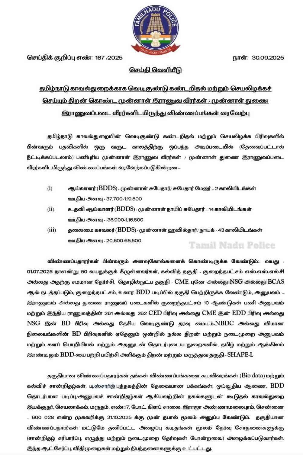 Interested and eligible candidates can apply through the prescribed application form. The Applicant needs to send the application form along with relevant documents to Additional Director of Police, Prakash Marutham No.17, Boat Club Road, Raja Annamalaipuram, Chennai-600028.