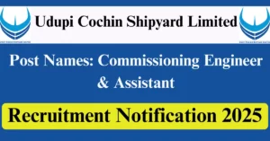 UCSL Recruitment 2025 Apply for 15 Commissioning Engineer & Assistant Vacancies in Udupi – Karnataka location. Udupi Cochin Shipyard Limited Officials are recently published a job notification to fill up 15 Posts through Walkin mode. All the eligible aspirants can check the UCSL career official website i.e., udupicsl.com recruitment 2025. The last date to attend for Walk-in-interview on 24-Nov-2025.