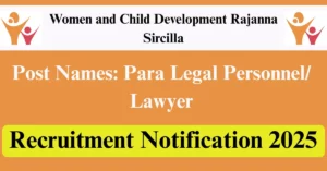 WCD Rajanna Sircilla Recruitment 2025 Apply for 1 Para Legal Personnel/ Lawyer Vacancies in Rajanna Sircilla – Telangana location. Women and Child Development Rajanna Sircilla Officials are recently published a job notification to fill up 1 Posts through Offline mode. All the eligible aspirants can check the WCD Rajanna Sircilla career official website i.e., rajannasircilla.telangana.gov.in recruitment 2025. The last date to Apply Offline on or before 16-Sep-2025.